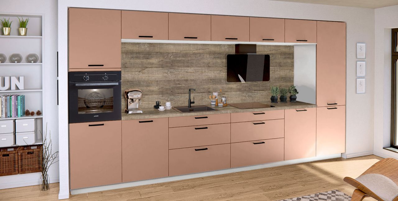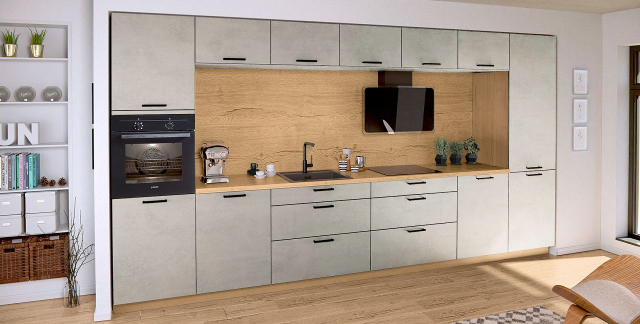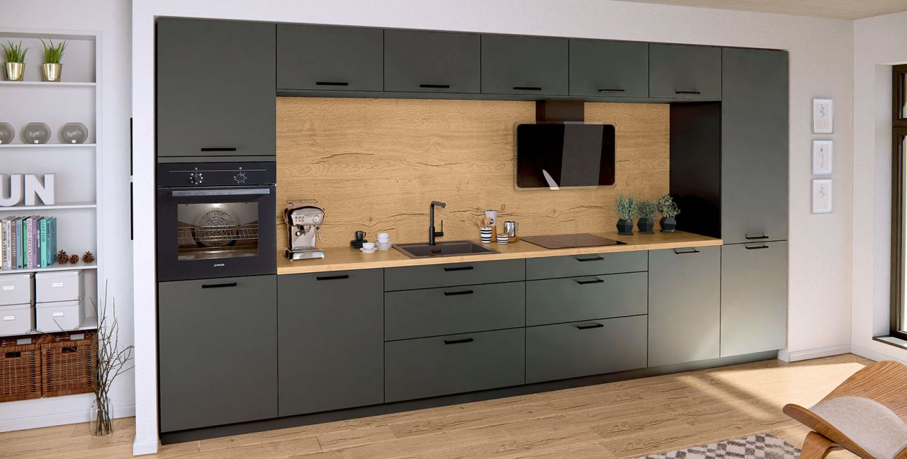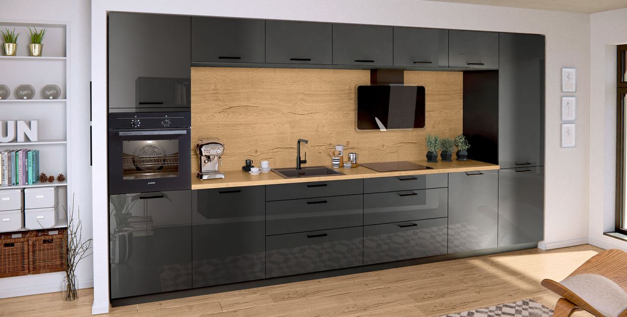 Rechte keuken Nobilia Flash ca. 420 cm, front: laklaminaat, schiefer grijs hoogglans, werkblad: decor eiken Sierra