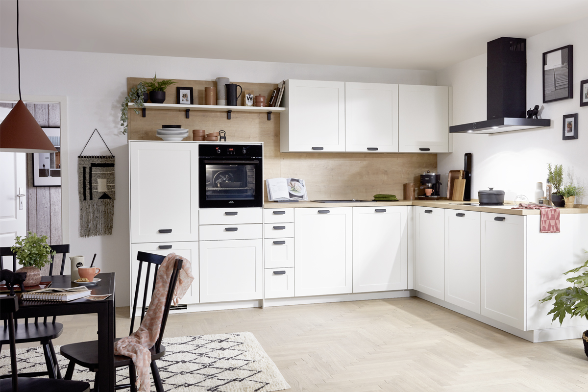 Voor veel plattegronden biedt ze de ideale vorm: de klassieke L-keuken met speciale hoekoplossingen voor kasten en een centrale werkruimte. Dit soort keuken zorgt voor kortere loopwegen, zodat u direct kunt koken en uw creaties een bijzondere toets kunt geven.